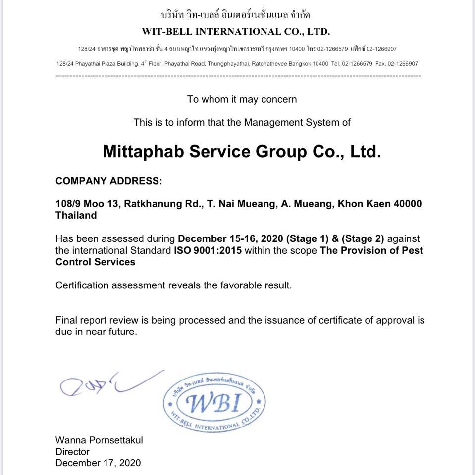 - ได้รับการรับรองระบบคุณภาพการบริการตามมาตรฐานอุตสาหกรรมเอส (มอก.เอส) การบริการกำจัดปลวก หนู และแมลง มอก.เอส 22-2561