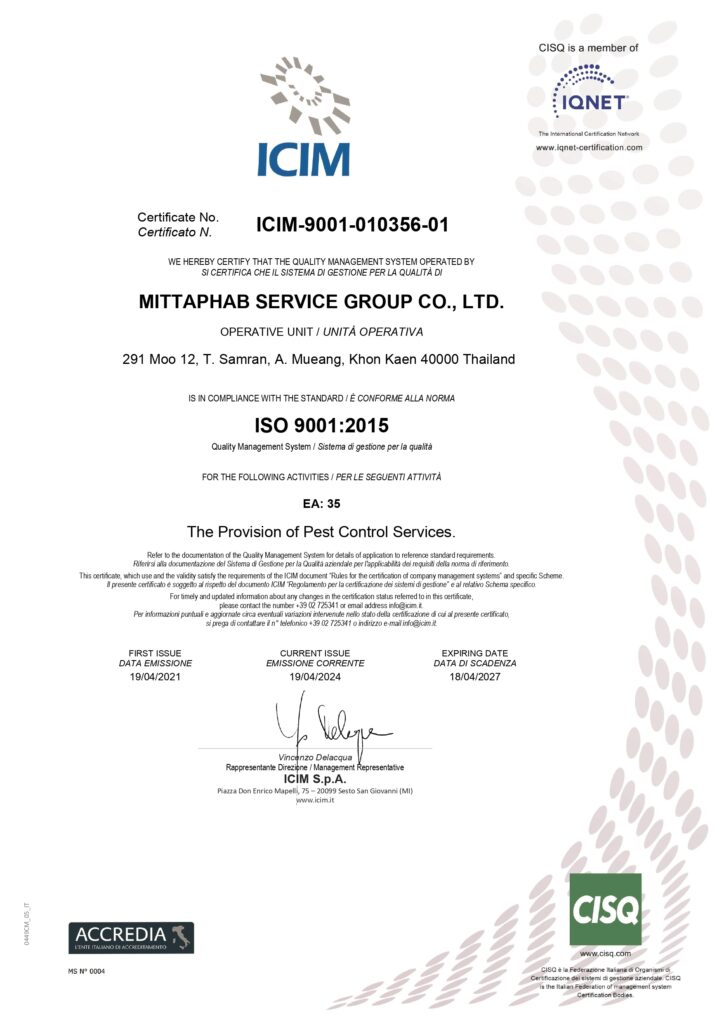 เราคือผู้เชี่ยวซาญในด้านการกำจัดแมลง กำจัดปลวก มด หนู แมลงสาบ อันดับ 1 ได้รับรองมาตรฐาน ISO 9001 :2015