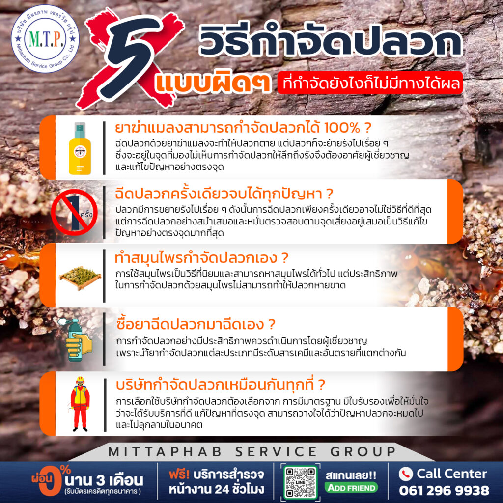 ฉีดปลวกด้วยยาฆ่าแมลงจะทำให้ปลวกตาย แต่ปลวกก็จะย้ายรังไปเรื่อย ๆ ซึ่งจะอยู่ในจุดที่มองไม่เห็นการกำจัดปลวกให้ลึกถึงรังจึงต้องอาศัยผู้เชี่ยวชาญและแก้ไขปัญหาอย่างตรงจุด